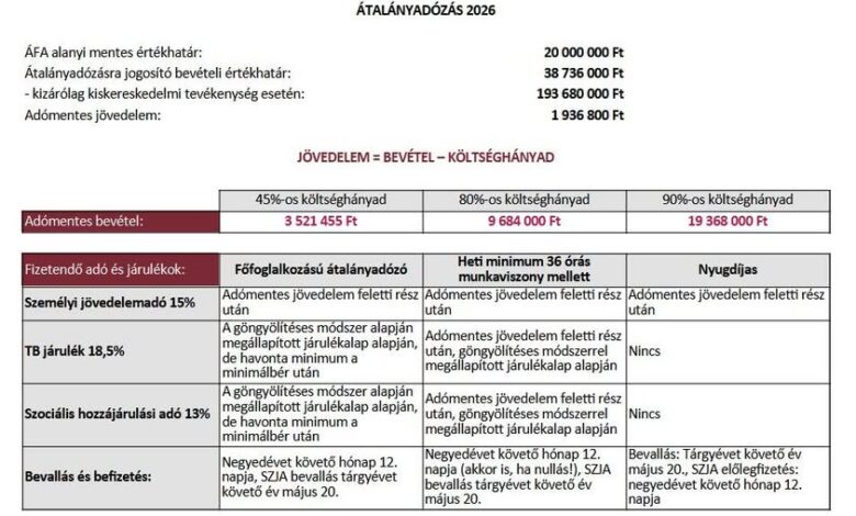 Az átalányadózás szabályai addig alkalmazhatók, ameddig a tárgyévi bevétel nem haladja meg a minimálbér éves összegének a tízszeresét, azaz 2026-ban 38.736.000 Ft az értékhatár.